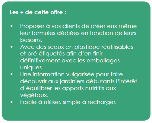 Les jardiniers péri-ubain et ruraux préfèrent souvent les amendement organiques et certains engrais en gros conditionnement. Nous proposons donc des offres en palette. Economique, ce systeme permet de proposer aux jardiniers des sacs de 3kg, 10kg, 15kg, 25kg et des bidon de 5l ou 10L. Les jardiniers citadins se dirigeront plutot vers les engrais vrac pour prendre la juste quantité et réutiliser leur conditionnement.